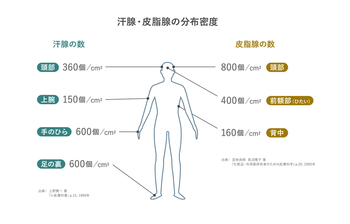 そして、汗腺(汗が出る所)は手の平や足の裏の次に多く1日約700〜900mLもの汗をかきます。