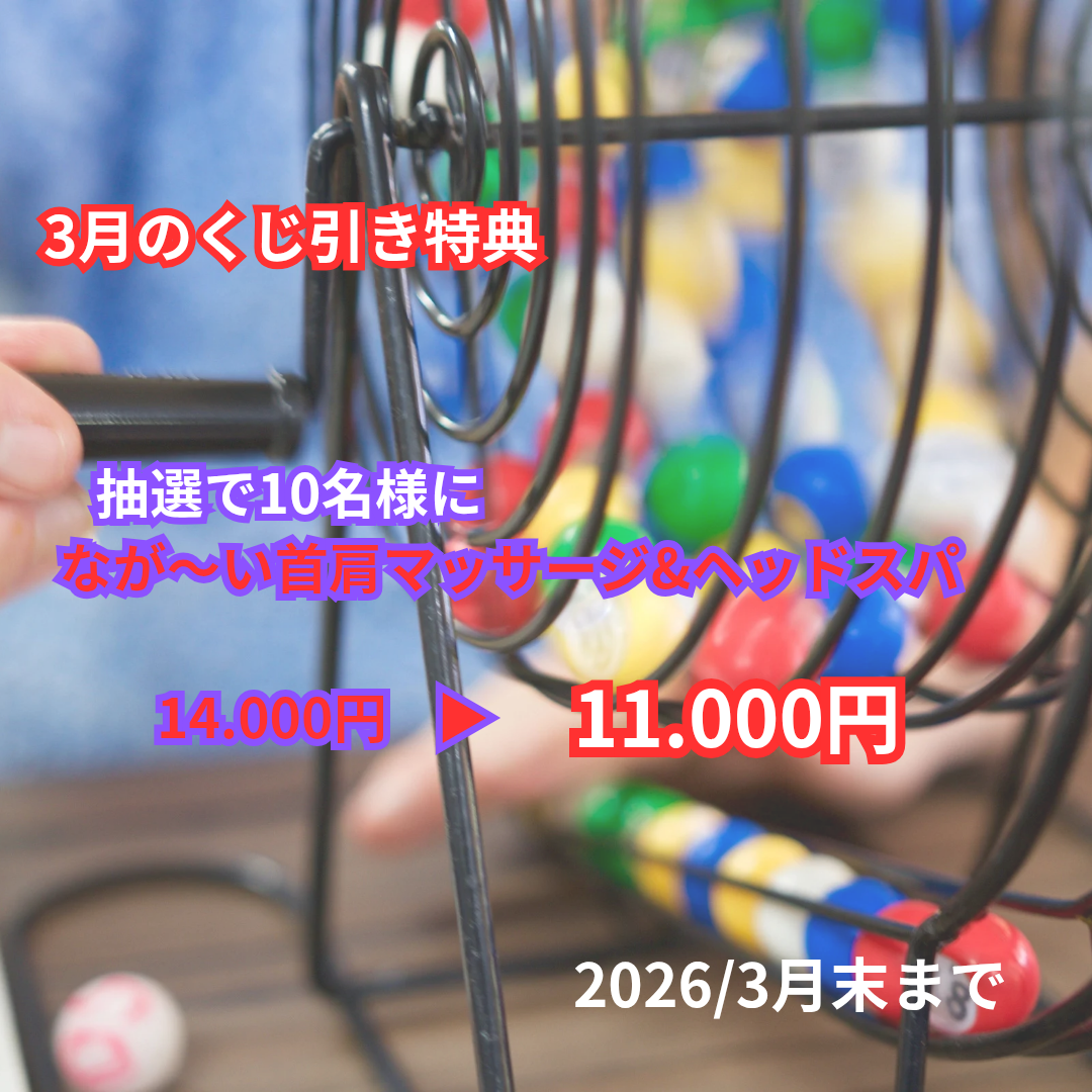 抽選で10名様に 『なが~い首肩マッサージ&ヘッドスパ 50分』14.000円 ▶ 11.000円